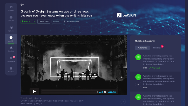 We organized our first exclusively online event using MyConnector. The platform allows integration of different types of content, it has an extraordinary expo area that make clients miss less the offline exhibitions and it provides different technichalities, like the poll option, that can lead to quite an interactive event.