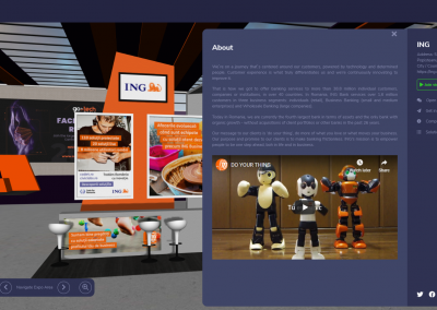 Personalized 3D booths with chat and video call – over 80 exhibitors, divided in 5 areas, had custom 3D booths where visitors could talk directly to an account manager, attend a booth presentation, download products files and watch preloaded product videos